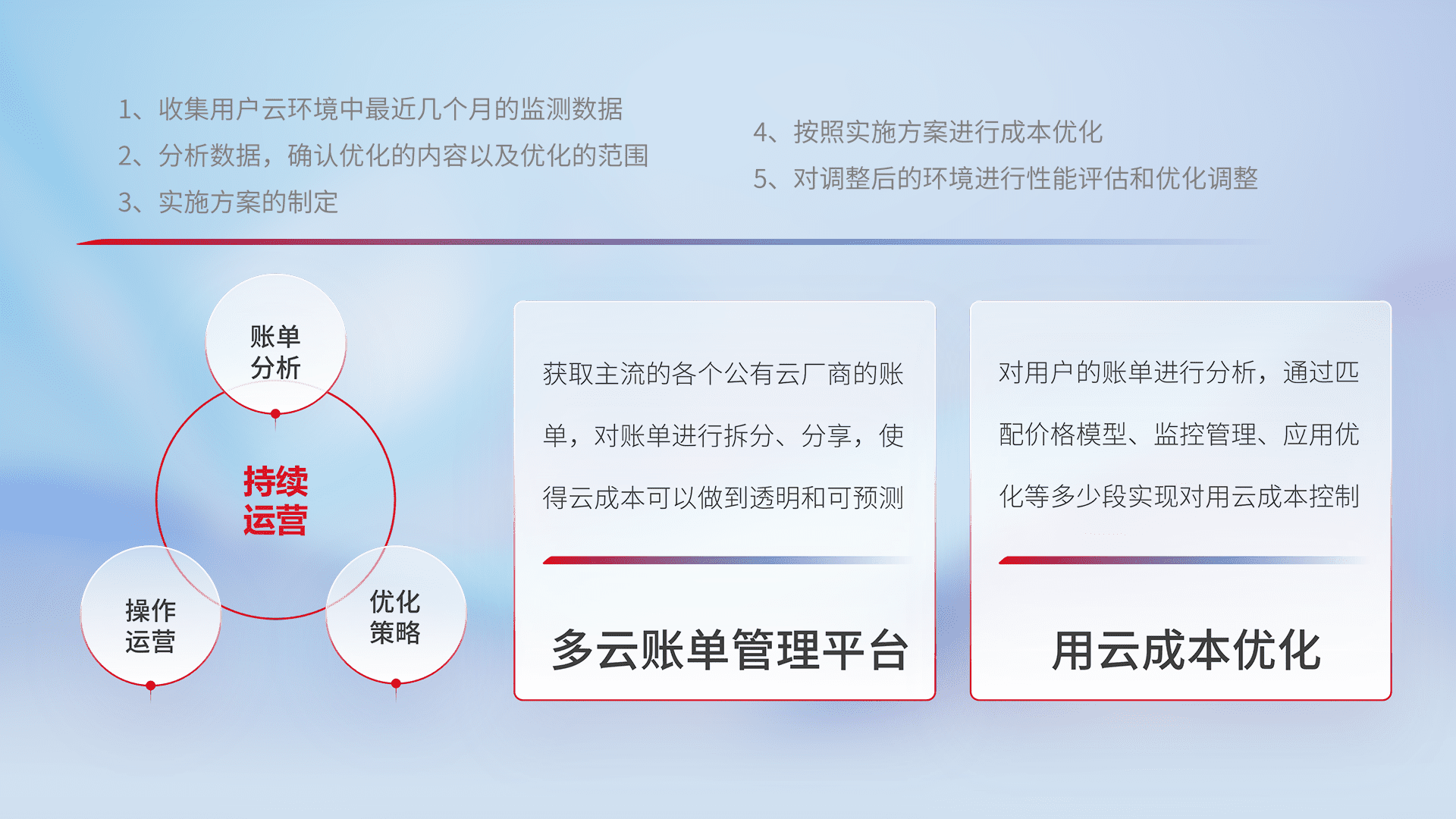 通过多云纳管,,以统一的资源数据模型把客户的云资源进行抽象和封装,,进而实现对多云资源的统一操作,,,,保障云资源管理的可靠性、、、稳定性与可用性。。。量身定制化运维内容,,配置、、、、开发运维、、、补丁管理、、、备份、、、监控、、认证和访问管理、、、审计和日常巡检等,,保障在用云过程中的可靠度,,,,稳定度以及高可用率。。。。