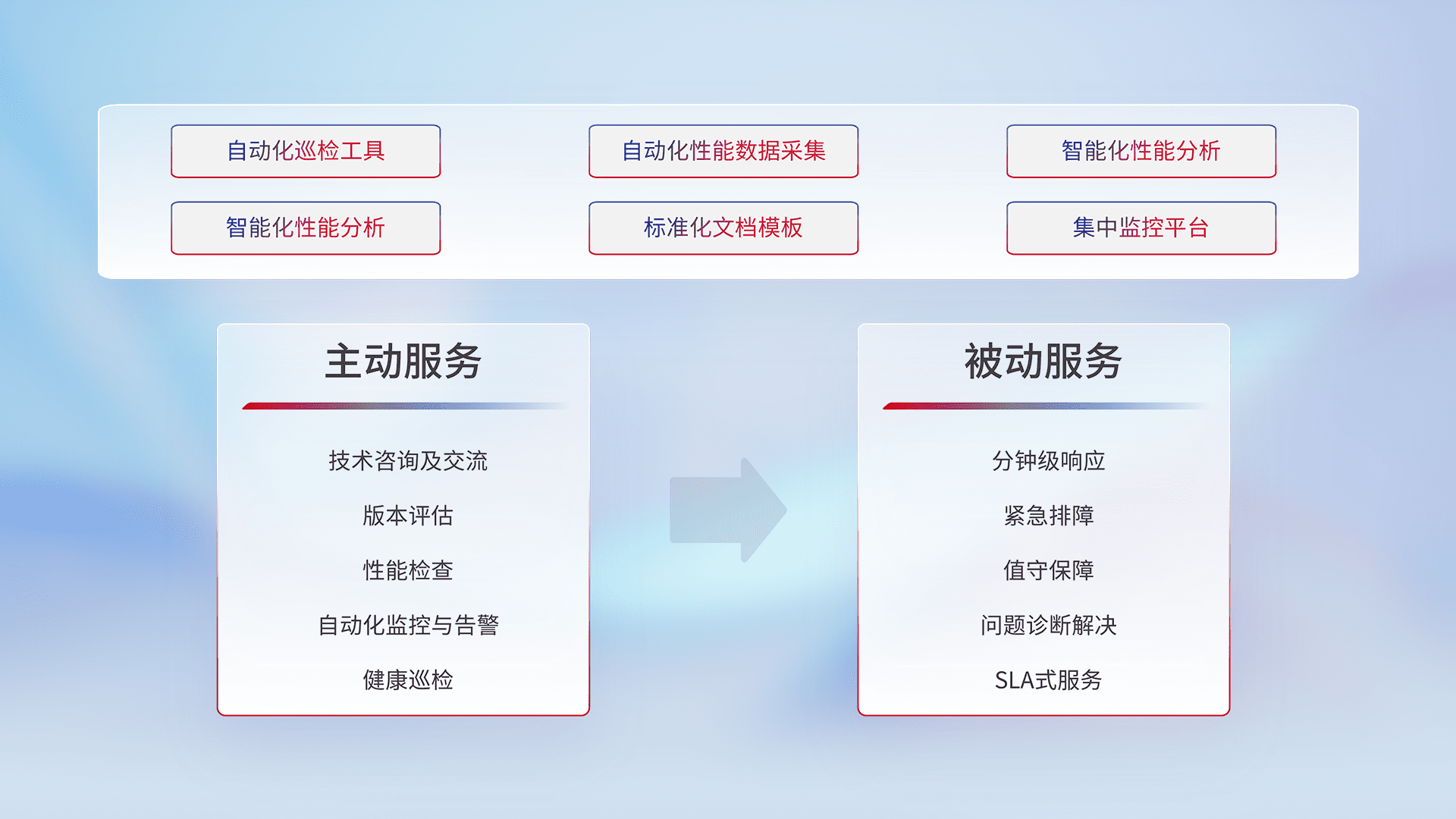 智能化工具和标准化文档,,保障服务质量,,提供主动服务(包含技术咨询、、版本评估、、、、性能检查、、、自动化监控与告警、、健康巡检)和被动服务包含(分钟级响应、、、紧急排障、、、值守保障、、问题诊断解决、、、SLA服务)。。。